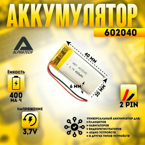Аккумулятор (батарея) универсальный, Li-Pol, 602040, 6*20*40мм, 2pin, 3.7V / 400 mAh