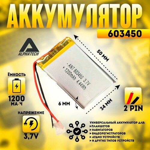Аккумулятор (батарея) универсальный, Li-Pol, 603450, 6*34*50мм, 2pin, 3.7V/1200mAh