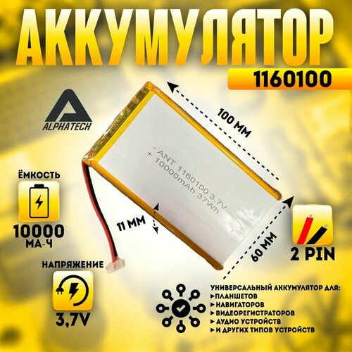 Аккумулятор (батарея) универсальный, Li-Pol, 1160100, 11*60*100мм, 2pin, 3.7V/10000mAh