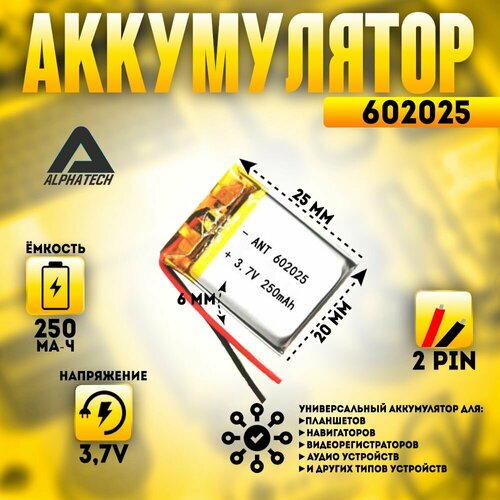Аккумулятор (батарея) универсальный, Li-Pol, 602025, 6*20*25мм, 2pin, 3.7V/250mAh
