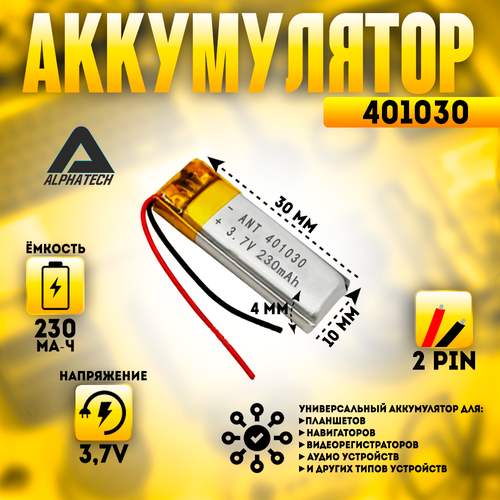 Аккумулятор (батарея) универсальный, Li-Pol, 401030, 4*10*30мм, 2pin, 3.7V/230mAh