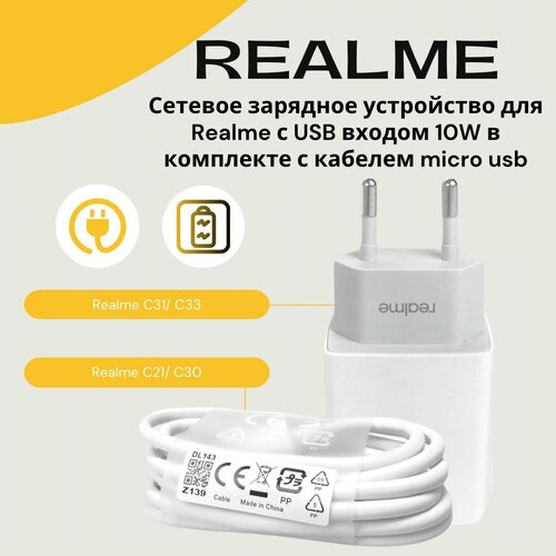 Сетевое зарядное устройство для Realme/ Oppo с USB входом 10W в комплекте с кабелем Micro USB 3A