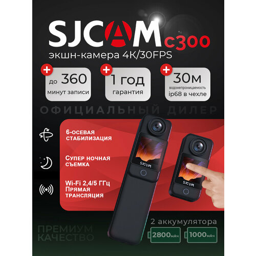 Экшн камера SJCam C300 черная с креплением, цифровым стабилизатором, водонепроницаемая 4K Ultra, аккумулятор 1000 и 2800мАч