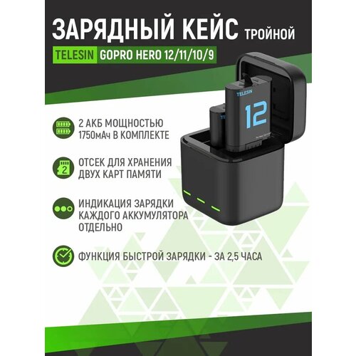 Зарядное устройство Telesin для GoPro Hero 12 (+2 закругленные акб, тройное), S0-BCG-04-TGP