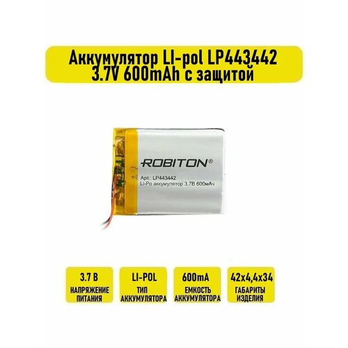 Аккумулятор LI-pol LP443442 3.7V 600mAh с защитой