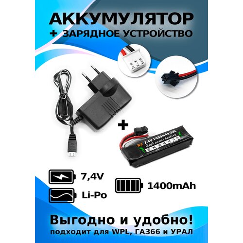 Аккумулятор Li-ion 7.4 V 1200mAh для игрушек на радиоуправлении, с разъемом SM-2P. Аккумулятор подходит для многих RC моделей 1:16 и 1:18, подходит для моделей WPL ГА
