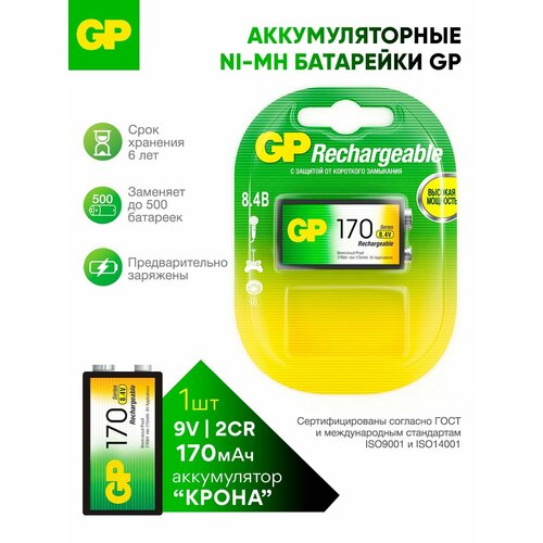 Аккумулятор Ni-Mh 170 мА·ч 9 В GP Rechargeable Крона 170, 1 шт.
