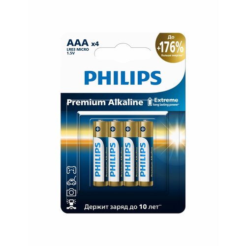 Батарейки мизинчиковые ААА Philips Power Alkaline (щелочные) LR03P4B/97, 4 шт. в блистере