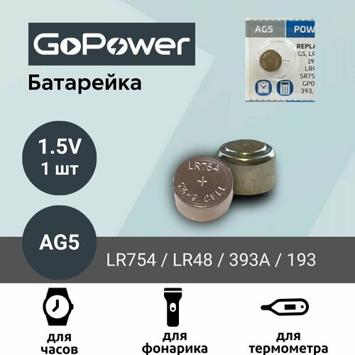 Батарейка GoPower AG5 (LR754, LR48, 393A, 193) Alkaline 1.55V (1 шт)