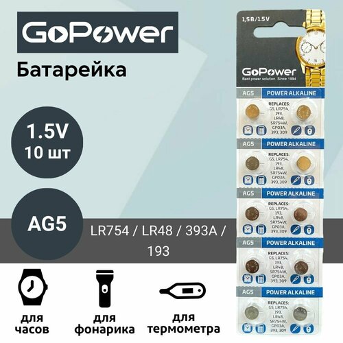 Батарейка GoPower AG5 (LR754, LR48, 393A, 193) Alkaline 1.55V (10 шт)