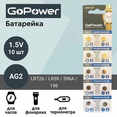 Батарейка GoPower AG2 (LR726, LR59, 396A, 196) Alkaline 1.55V (10 шт)