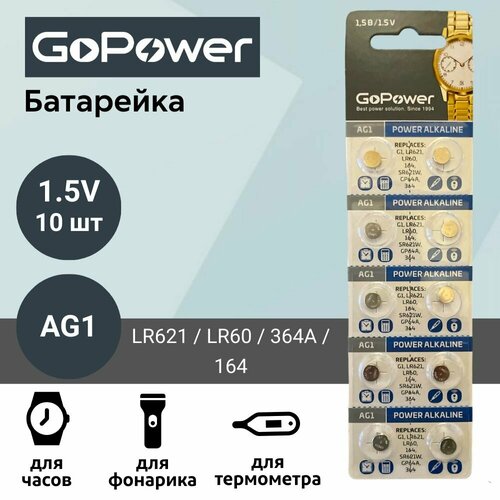 Батарейка GoPower AG1 (LR621, LR60, 364A, 164) Alkaline 1.55V (10 шт)