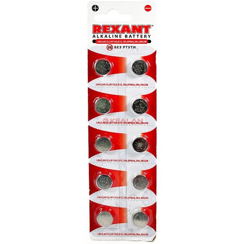 Батарейка REXANT LR43, AG12, LR1142, G12,186, GP86A,386, SR43W комплект10шт-Компактные алкалиновые(щелочные) батарейки применяются ...
