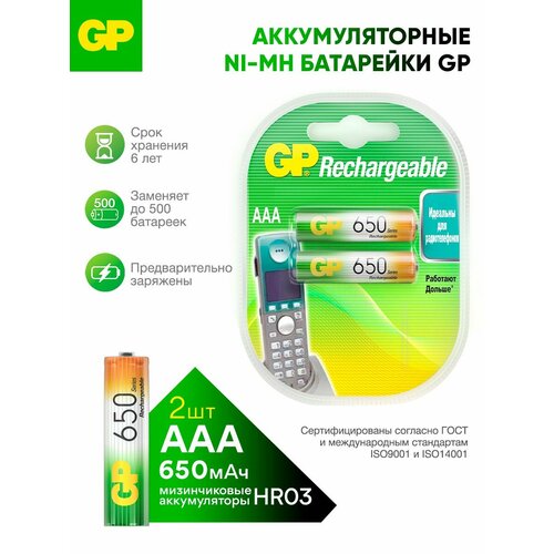 Батарейки ААА аккумуляторные GP, перезаряжаемые аккумуляторы, 650 мАч, 1.2 В, набор 2 шт. RGY