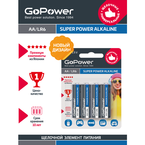 Батарейка GoPower LR6 AA BL4 Alkaline 1.5V (пальчиковая) - 4 шт.