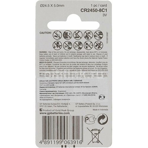 Батарейка GP Lithium Cell CR2450, в упаковке: 5 шт.