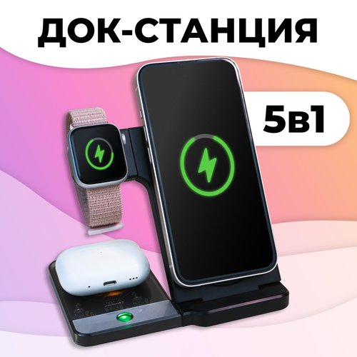 Док-станция 5 в 1 для телефона iPhone, Android, Apple Watch, AirPods / Беспроводная зарядка MagSafe 15W на Айфон, Андроид, Эпл Вотч, АирПодс / Черная
