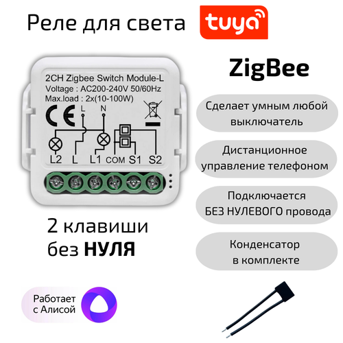 Реле питания для света в подрозетник Tuya ZigBee, 2 кнопки, Алиса, без Нуля