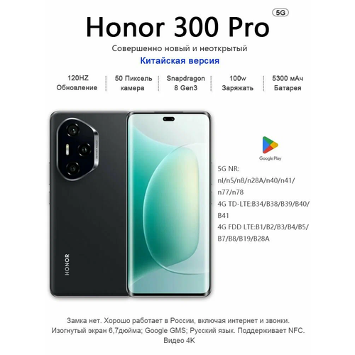 Honor Смартфон 300 Pro Snapdragon 8 3-го поколения 12/512 ГБ, поддержка Google\ Русский CN ,черный