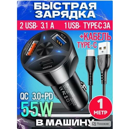 Автомобильное зарядное устройство для телефона 55 Вт 2USB Type-A + 1USB Type-C, быстрая зарядка в прикуриватель