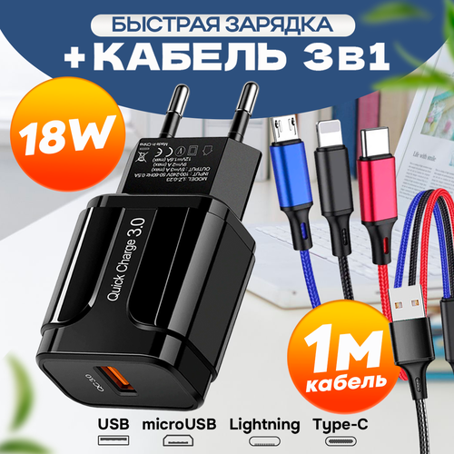 Быстрое зарядное устройство+ кабель 3в1 для телефона / сетевой адаптер телефона / блок питания цвет черный