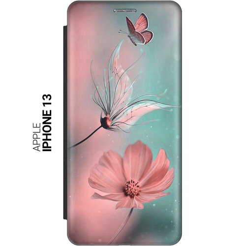 Чехол-книжка на Apple iPhone 13 с принтом "Бабочка и цветы" черный