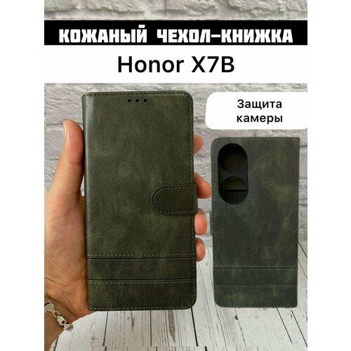 Комплект Кожаный чехол-книжка для Honor X7b Хонор Х7Б из эко-кожи зелёный и Защитное стекло