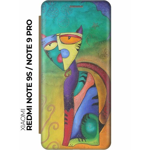 Чехол-книжка Разноцветный котик на Xiaomi Redmi Note 9s / Note 9 Pro / Сяоми Редми Ноут 9с / Ноут 9 Про золотой