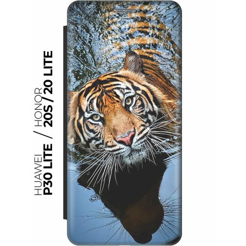 Чехол-книжка Тигр купается на Honor 20 Lite / 20s / Huawei P30 Lite / Хуавей П30 Лайт / Хонор 20 Лайт / 20s черный