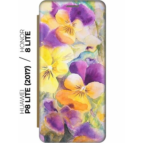 Чехол-книжка Сиреневые и желтые цветы на Honor 8 Lite / Huawei P8 Lite (2017) / Хонор 8 Лайт / Хуавей Р8 Лайт 2017 золотой