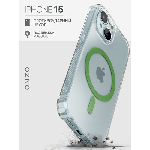 Противоударный чехол мэгсэйф на iPhone 15 / Айфон 15 с функцией магсейф, прозрачный с ребристыми гранями, лайм