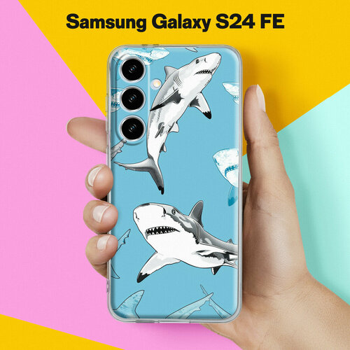 Силиконовый чехол на Samsung Galaxy S24 FE с принтом "Акула с фоном" с прозрачными бортиками