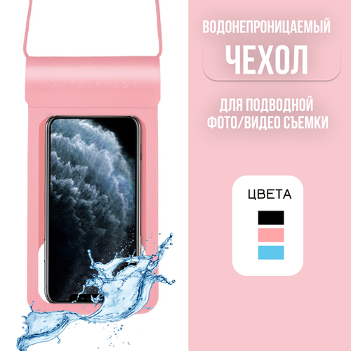 Водонепроницаемый розовый чехол для телефона / Универсальный непромокаемый кейс на смартфон для подводной съемки со шнурком / Герметичный