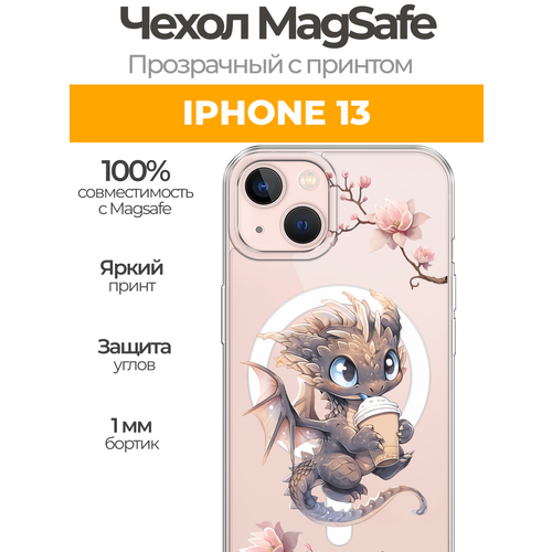 Чехол на Айфон 13 MagSafe с магнитом с принтом "Тёмный дракончик со стаканом"