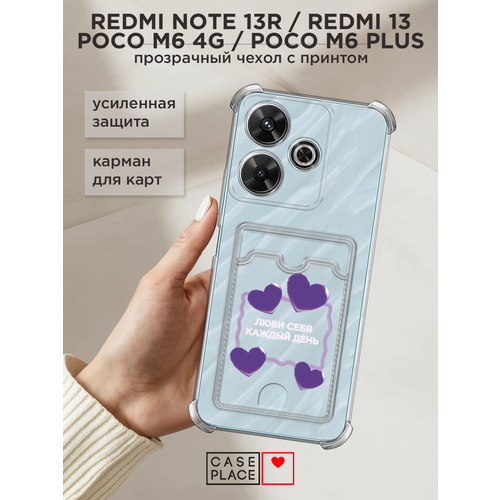 Чехол на Xiaomi Redmi Note 13R/Redmi 13/Poco M6 4G/M6 Plus (Сяоми Редми Ноут 13R/Редми 13/Поко М6 4G/M6 Плюс) с картой и принтом Сердечки и надпись Люби себя