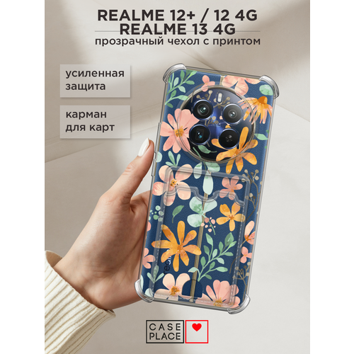 Чехол на Realme 12+/12 4G/13 4G (Реалми 12 Плюс/12 4G/13 4G) с картой и принтом Цветочки и стебли