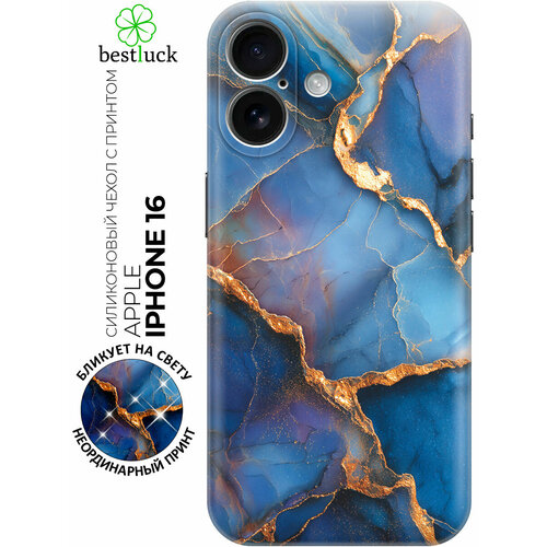 Силиконовый чехол на Apple iPhone 16 с принтом "Синий мрамор с золотом"