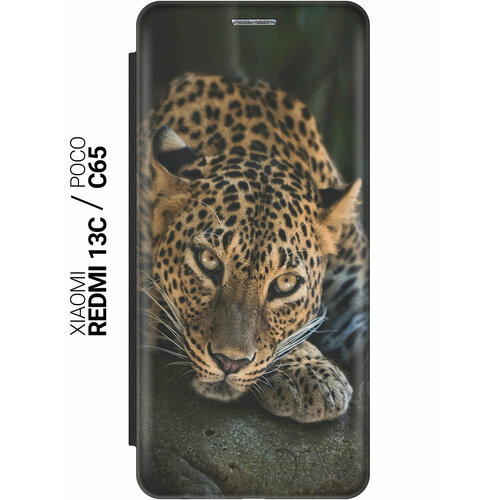 Чехол-книжка на Xiaomi Redmi 13C / Poco C65 / Сяоми Редми 13С / Поко С65 с рисунком "Загадочный леопард" черный