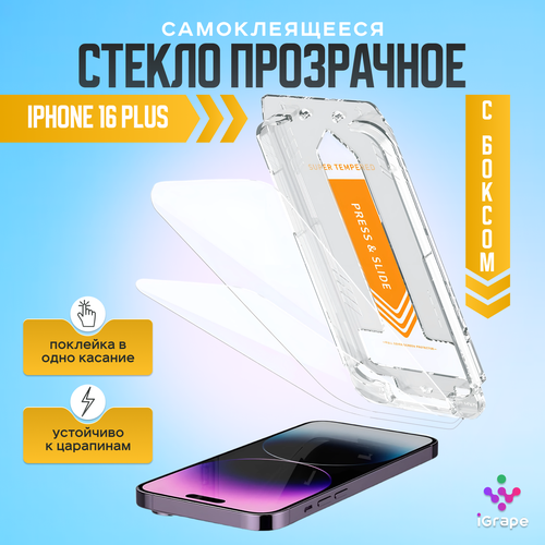 Защитное стекло самоклеящееся с боксом iPhone 16 Plus, iGrape (Прозрачное) / стекло на айфон 16 плюс