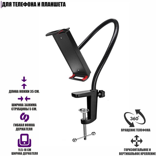 Гибкий держатель кронштейн GDTS-18 для планшета до 18 см на усиленной струбцине