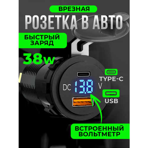 Автомобильное зарядное устройство для телефона, USB/Type-C 38Вт, врезное, быстрая зарядка в прикуриватель QC/PD, черное