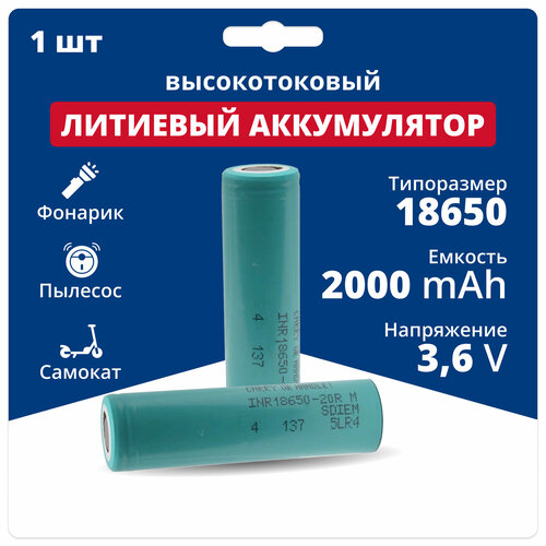 Литий ионный аккумулятор 18650 высокотоковый Li-ion INR18650-20R, аккумуляторная батарейка 3,6 V, 2,0 Аh, 22 A