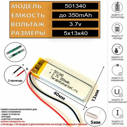 Аккумулятор батарея 5х13х40 501340 350mAh 3.7v для зарядного кейса наушников беспроводных
