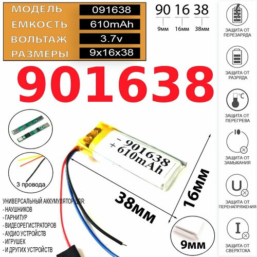 Аккумулятор для клавиатуры, джойстика, мышки 3.7v 610mAh 3 провода 3 pin 9x16x38 (универсальный акб / li-pol батарея)