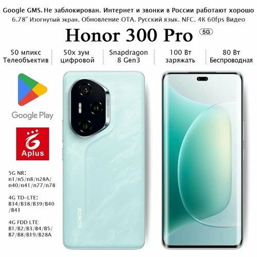 Honor Смартфон 300 Pro, Snapdragon 8 Gen3 80 Вт Беспроводная зарядка, 12/256 ГБ