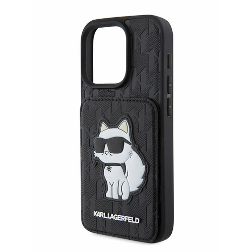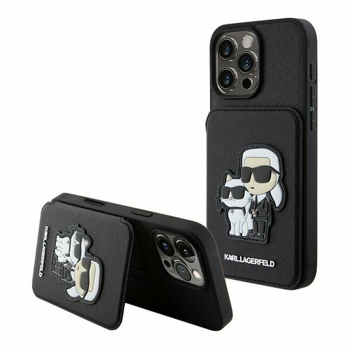 Karl Lagerfeld для iPhone 15 Pro чехол с карманом для карт Saffiano иск. кожа NFT Karl & Choupette метал. вставка черный