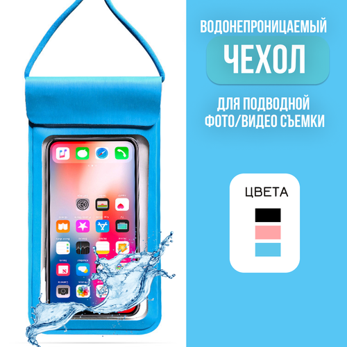 Водонепроницаемый синий чехол для телефона / Универсальный непромокаемый кейс на смартфон для подводной съемки со шнурком / Герметичный