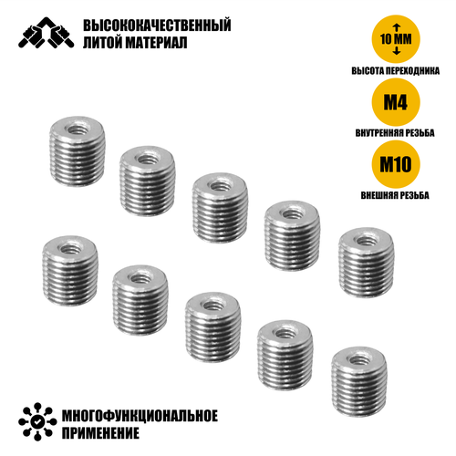 Резьбовая гайка переходник с внешней резьбой М10 и внутренней резьбой М4, высота 10 мм, 10 шт