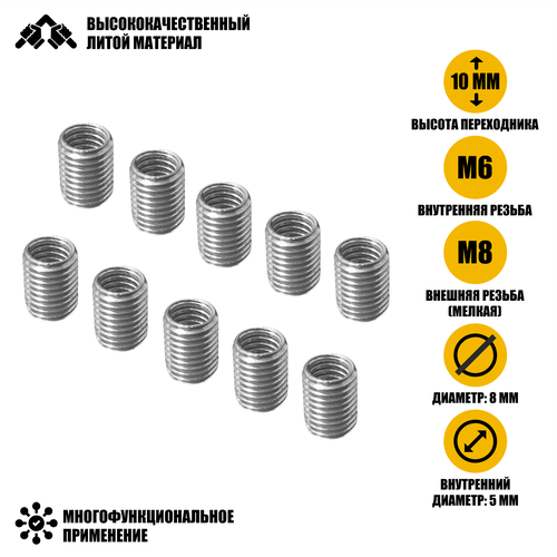 Резьбовая гайка переходник с внешней резьбой М8 и внутренней резьбой М6, высота 10 мм, 10 шт