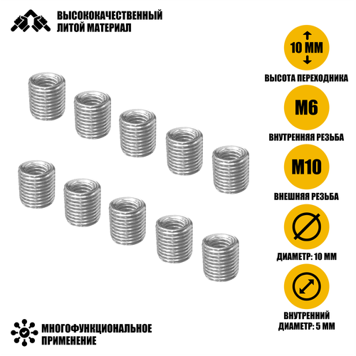 Резьбовая гайка переходник с внешней резьбой М10 и внутренней резьбой М6, высота 10 мм, 10 шт